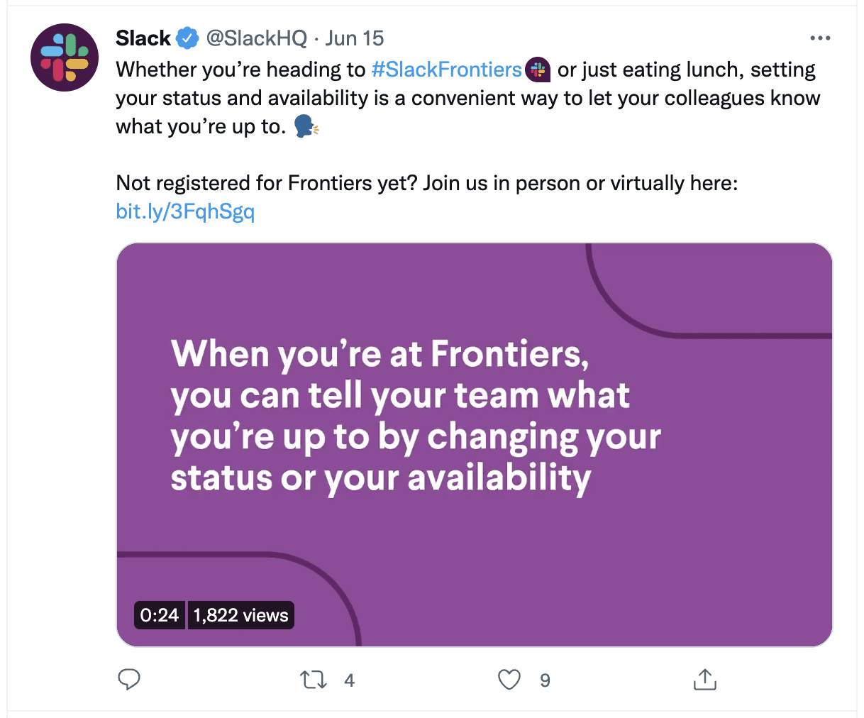Slack is adept at using Twitter to build excitement for upcoming events among its audience. Even a link has been provided to help their audience sign up faster. Visual content is always more appealing than any other content form. Hence, Slack has created a 30-second video to offer further details on the event.