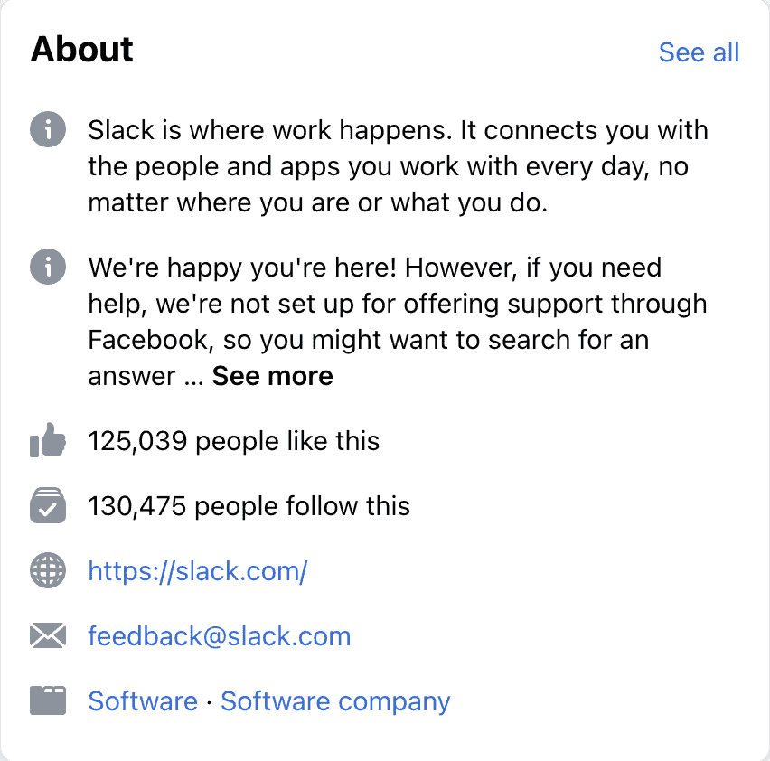 Facebook provides an option for an “About” section in place of the bio and highlights. Slack has highlighted its mission statement, here again, making it clear how the brand is dedicated to solving a customer pain point.