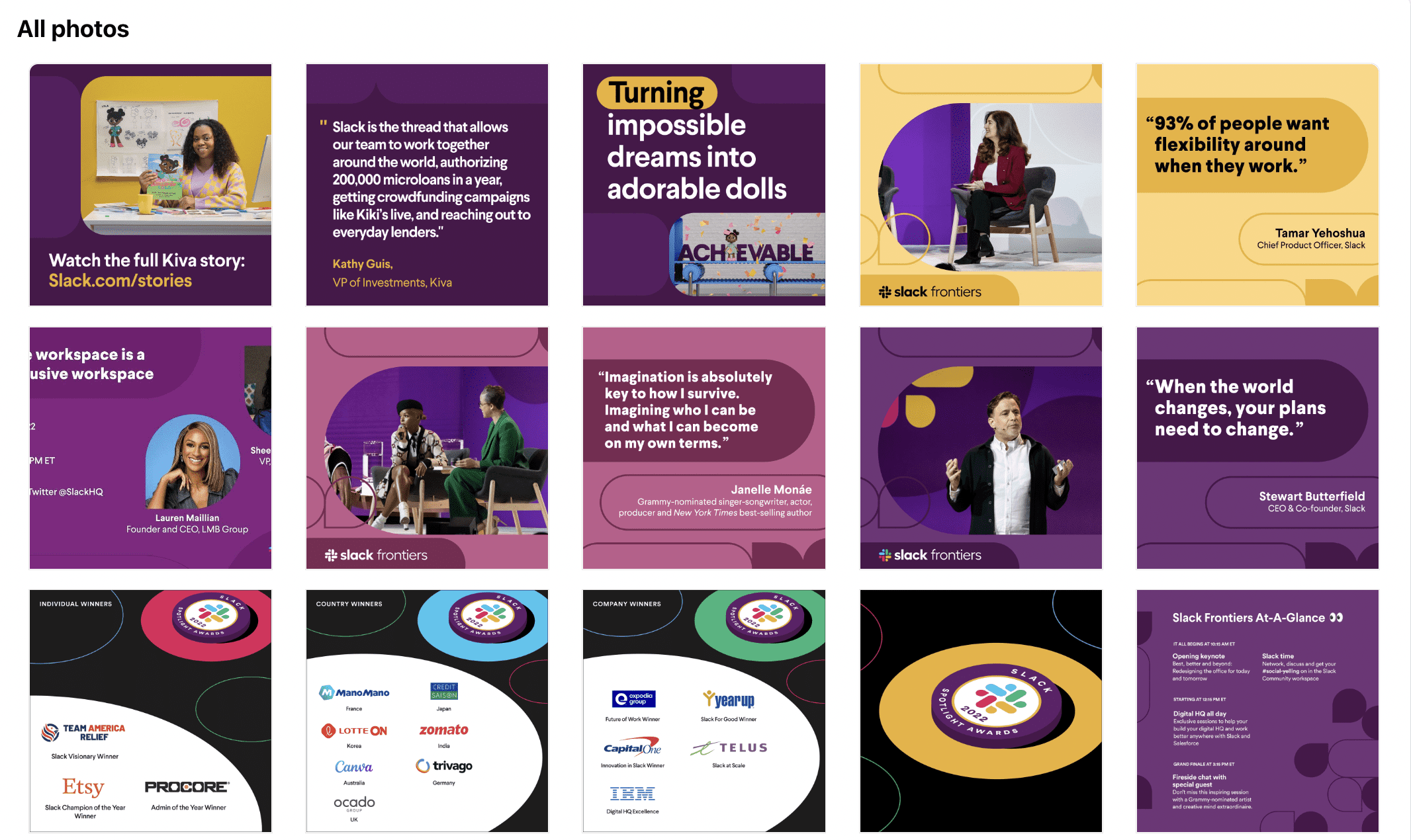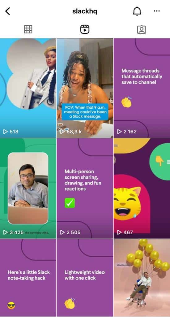Looking at Slack’s Instagram account, you can see how everything blends so flawlessly with the color scheme and design of the B2B brand. The use of only brand colors increases brand recognition. You must use the same design strategy for your social media marketing efforts as well.