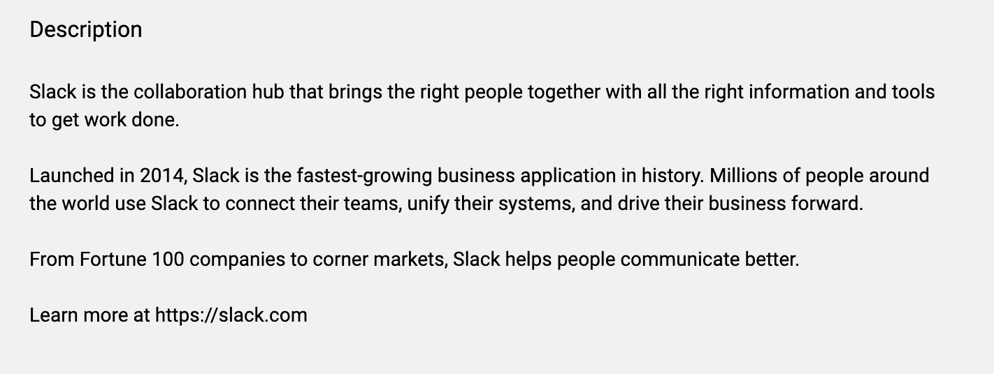 Slack has decided to highlight its history here rather than its mission. Here, the brand wants to give the audience additional information about Slack. A website link is provided so users can access and find more information.