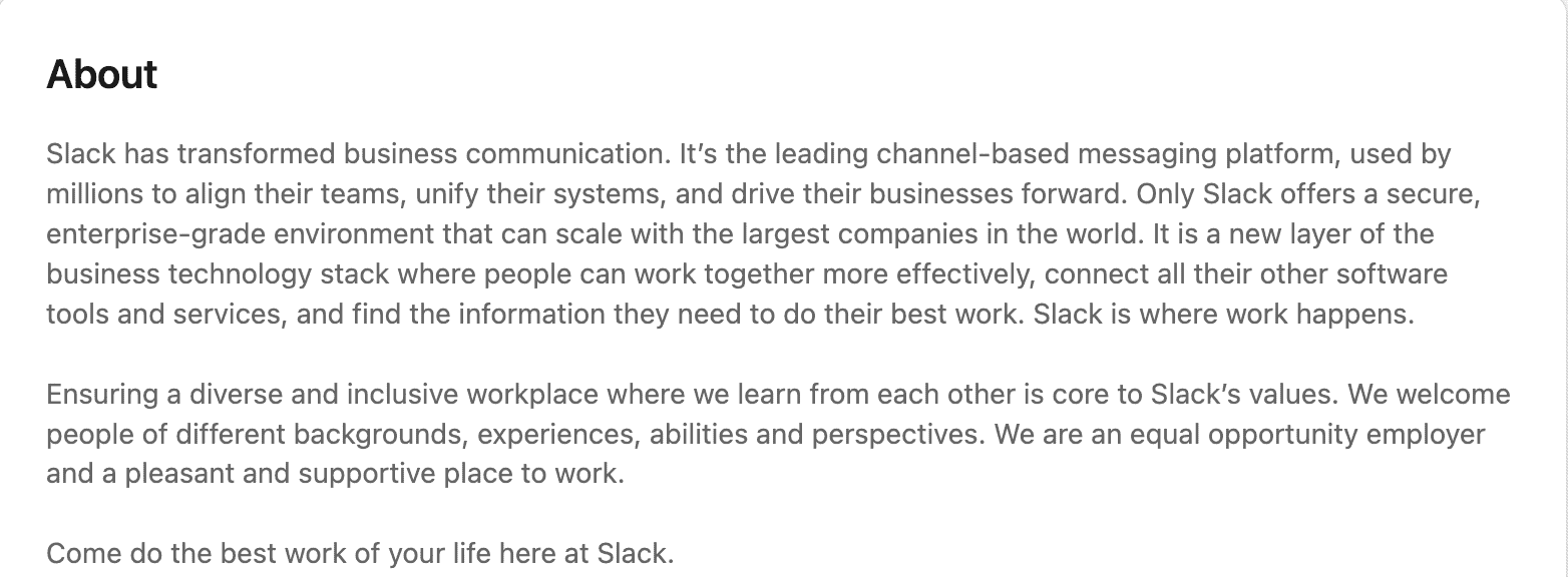 Slack has used the “About” section to share how it is transforming the workplace and what makes it a great place to work. Using words like “diverse and inclusive workplace,” “equal opportunity,” and “supportive place to work” show how the brand is committed to employee well-being.