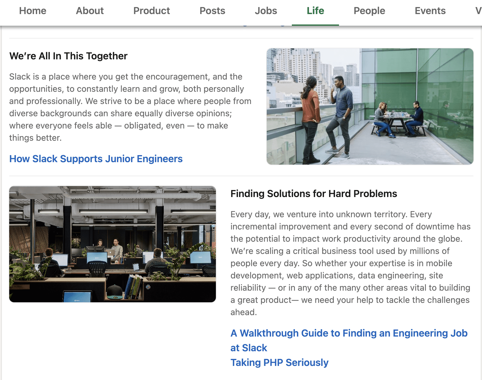 What it takes to work at Slack is outlined in detail on the “Life” page. This page’s main goal is to engage current employees and attract new talent for the company. Slack has used the page to show what it is like to work at Slack and how the brand emphasizes inclusivity and diversity.