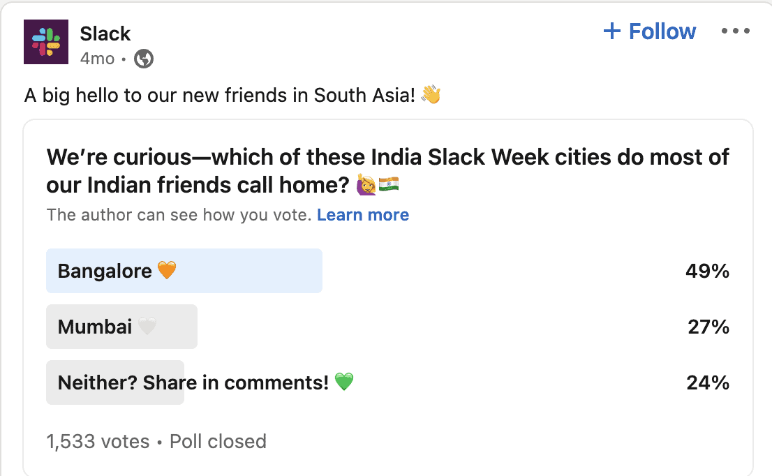 Slack has used LinkedIn polls to entice action and boost engagement – feature that you must explore for your B2B business. LinkedIn polls are used to interact with your audience, boost engagement, get to know them better, receive feedback and even qualify prospects that you can later contact and convert.