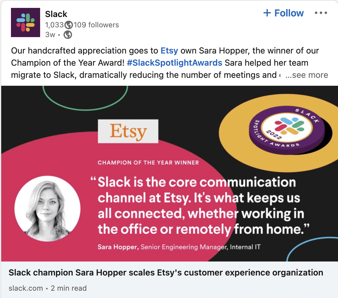 Slack shares company blogs on LinkedIn to reach more people and increase website traffic. This is a great example of repurposing content.