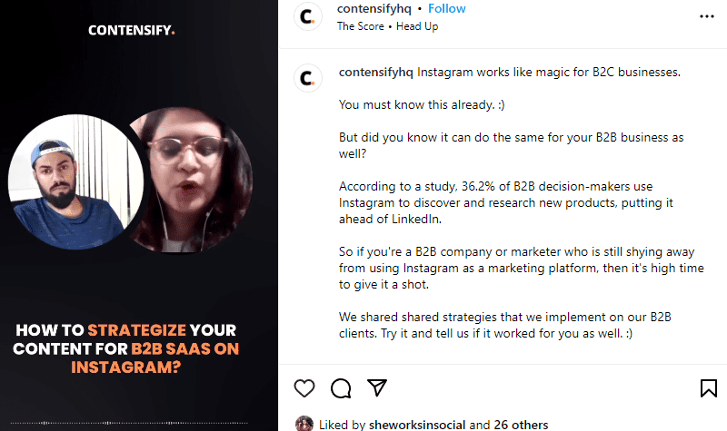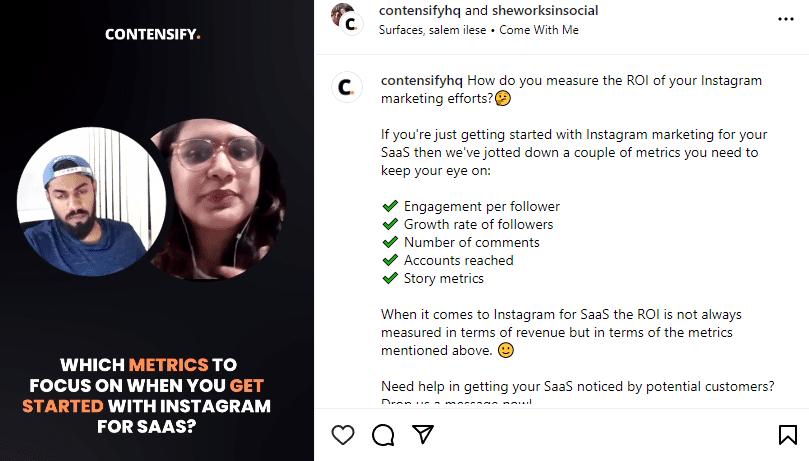 For example, Contensify has used the Instagram reel feature to host Q&A sessions where they briefly discuss a particular topic with industry experts. This can help build trust and loyalty with the audience, who see the brand as a valuable resource.