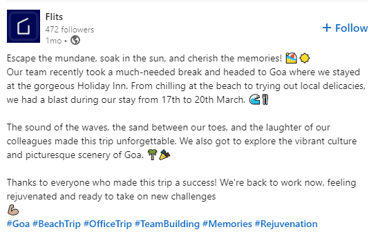 For example, Flits leverages social media platforms such as LinkedIn to showcase its company culture and employees. The brand shares posts, stories, featuring its employees, highlighting their contributions, behind-the-scenes, team building activities, etc. This showcases that the company values its employees and encourages a fun and collaborative environment.