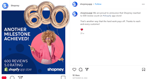 For example, Shopney shares regular updates on its social media channels about its progress towards its goals. Look at these posts where they have shared news about reaching a particular milestone, such as hitting a certain number of downloads, app installs, or customer sign-ups.
