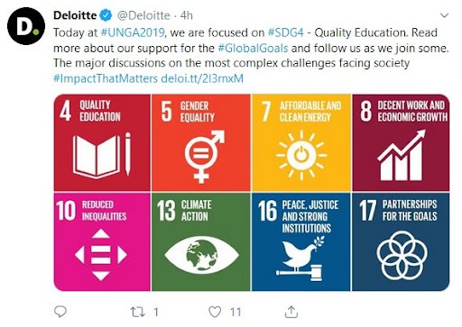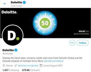 Twitter tagline: “Sharing the latest news, research, events, and more from Deloitte Global and the Deloitte network of member firms.”