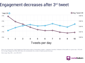 According to the chart above, posting 3 times is the sweet spot. Because engagement decreases after the 3rd tweet.