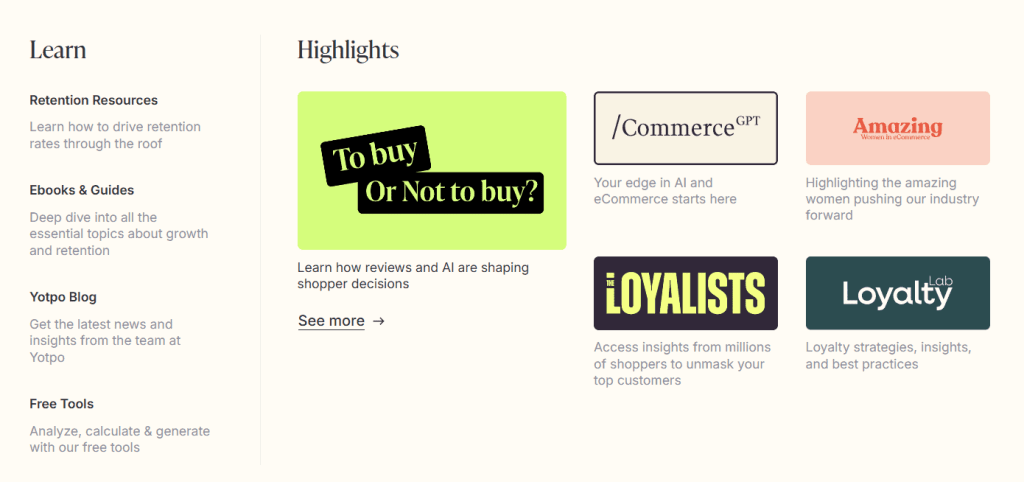 Yotpo maintains an extensive resource center filled with comprehensive guides, best practices, and strategic frameworks. This hub is a collection of retention resources, e-books & guides, as well as free tools, that cover everything from beginner guides on setting up review collections to advanced strategies for optimizing customer lifetime value.