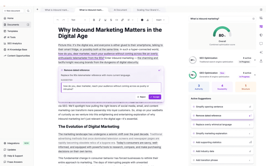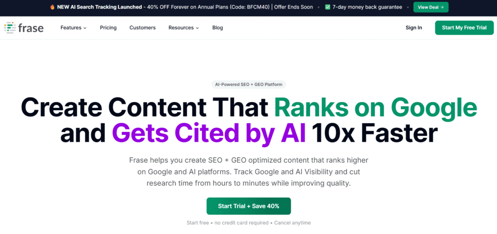Frase AI is built for teams who want to create content that ranks on Google and also gets cited across AI platforms like ChatGPT, Claude, Gemini, and Perplexity. It combines content research, drafting, and optimization into one workflow, so you can move from idea to publish-ready content much faster.