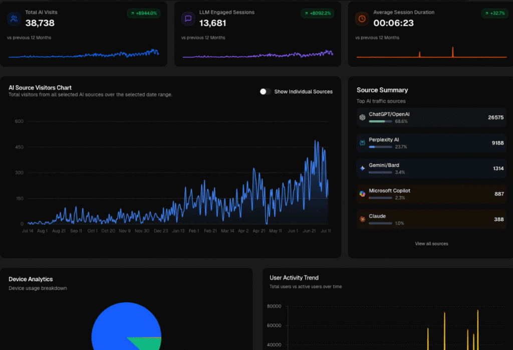 It also goes a step further by tracking how often your brand appears in AI-generated responses across tools like ChatGPT, Gemini, Claude, and Perplexity.