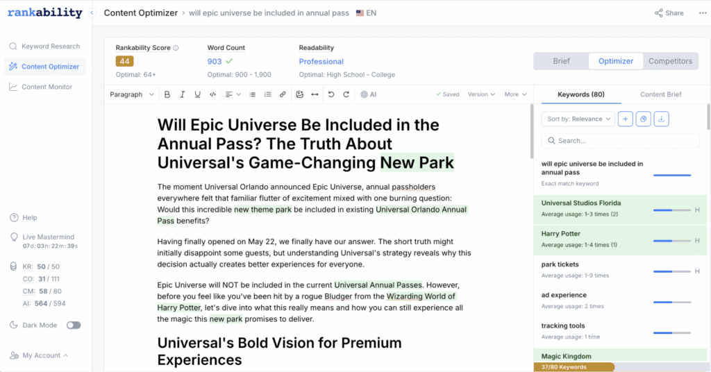 Rankability is designed to help marketers optimize content for both traditional search engines like Google and emerging AI search platforms. It brings keyword research, content briefs, optimization scoring, and AI writing into one workflow, making it easier to create content that aligns with real search intent.