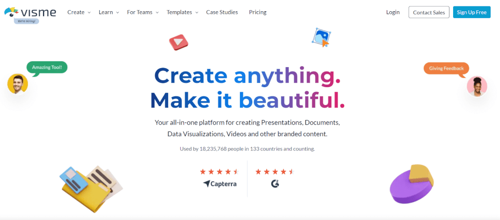 Visme is a Canva alternative for designing websites and social media content. It comes with an intuitive drag-and-drop feature that lets you create designs out of pre-made templates.