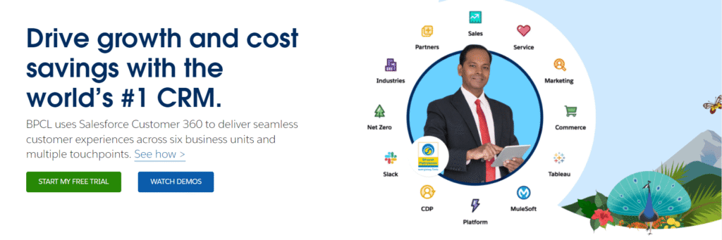 Salesforce is a cloud-based CRM tool that provides cloud services to businesses to build better customer relationships. It consists of sales, marketing, IoT, service, commerce, analytics, health, and financial cloud. Each one caters to a specific purpose.
