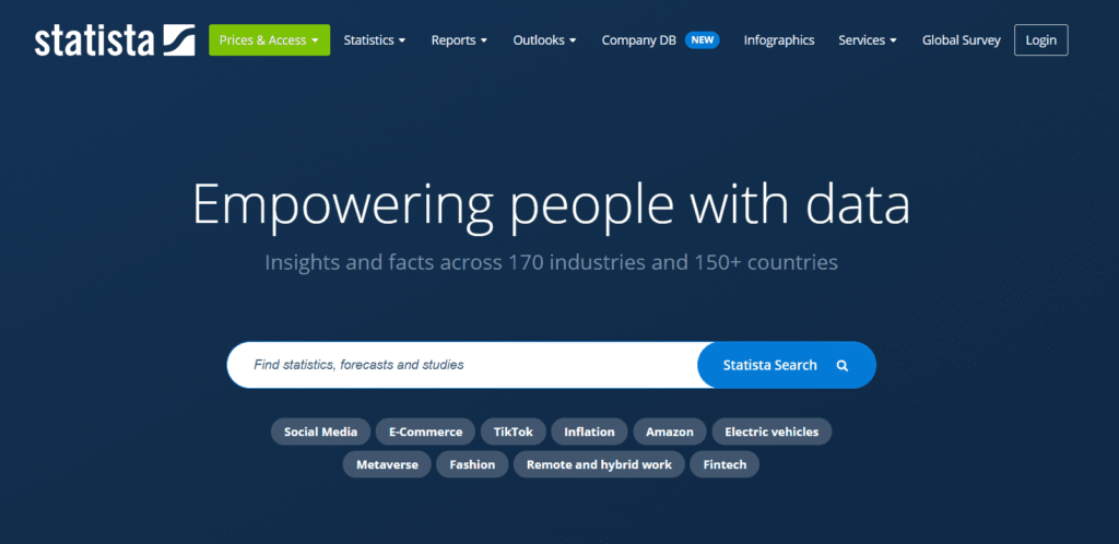 Statista provides market and consumer data that you can use in your blogs, case studies, and reports. It contains data on 170 industries, including media, business, tech, politics, and society.