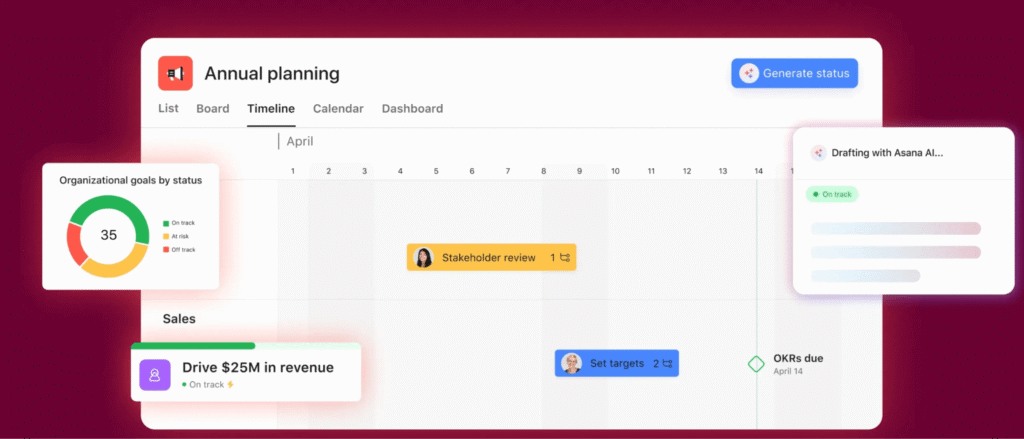 Asana is widely used by marketing teams to plan and manage content workflows. It helps break content into clear tasks, assign ownership, and track progress across timelines and boards, which is useful when multiple stakeholders are involved.