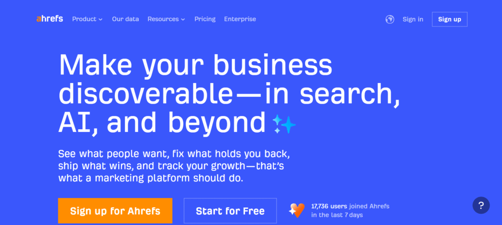 With tools for keyword research, backlink analysis, site audits, and content discovery, Ahrefs supports data-driven content planning. Teams often rely on it to prioritize topics, refresh existing content, and build strategies that improve search visibility over time.
