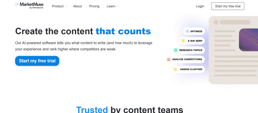 MarketMuse is an AI-driven platform designed to support strategic content planning. It helps teams build stronger content strategies by analyzing existing content, identifying opportunities, and prioritizing topics based on organic search potential.