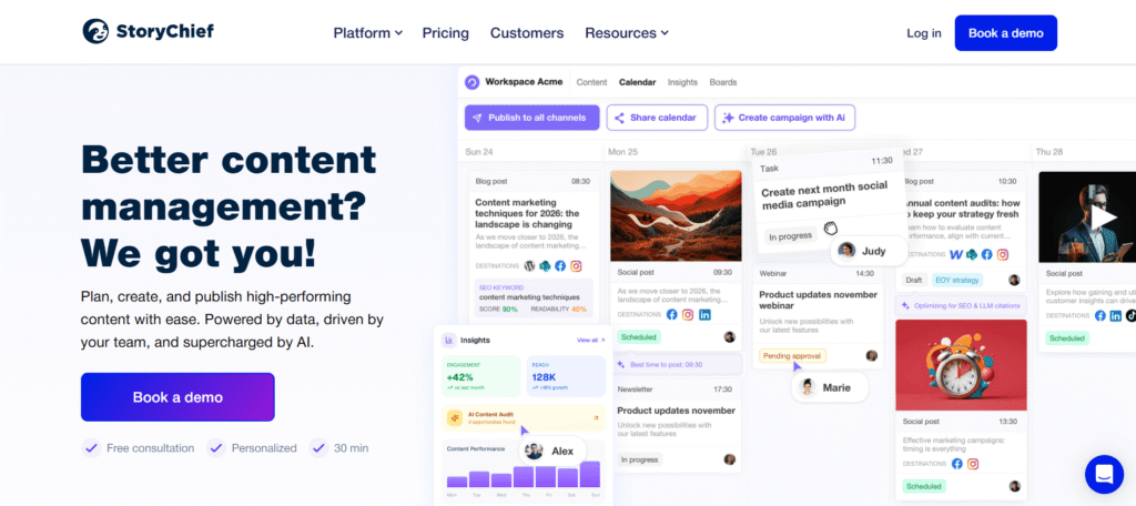 The platform combines SEO strategy, collaborative writing, task management, and a unified content calendar with multi-channel publishing. AI-driven insights and regular content audits help teams plan content with performance in mind, which makes StoryChief a good option for teams looking to scale content without added complexity.